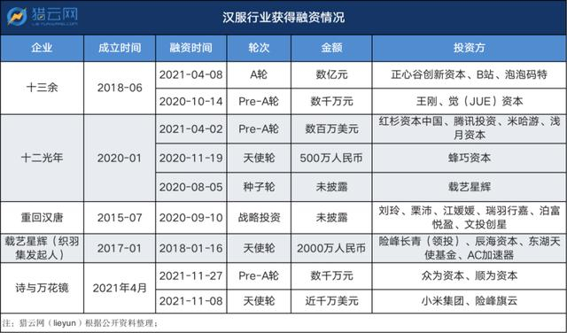 虽然过去几年间,资本开始入局汉服行业,甚至出现了诸如B站、泡泡玛特等新消费企业,但目前汉服服装市场投融资事件不足10起,仅有诸如十三余等头部品牌获得投资。