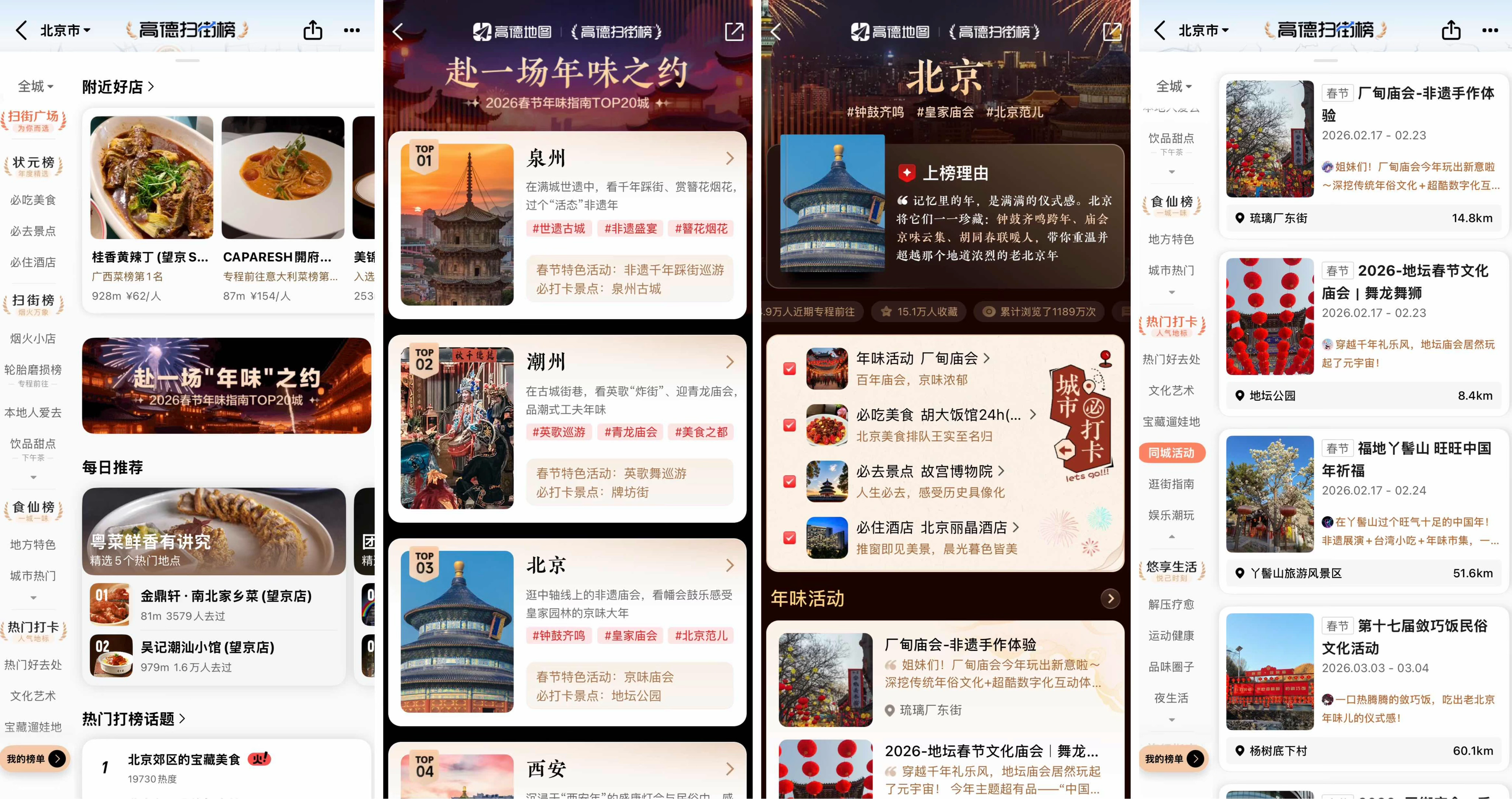 针对春节多元化的出游需求,高德扫街榜基于平台真实出行大数据,筛选出最具本地特色的体验点,正式发布“2026春节年味指南”。该指南聚焦北京、西安、泉州、潮州、哈尔滨、广州等20个年味浓郁的热门城市,为用户提供吃喝玩乐一站式的消费决策指引。