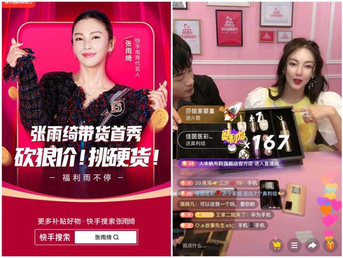 6月16日,快手电商代言人张雨绮迎来快手直播带货首秀,与快手主播辛巴同台直播,单场支付金额突破2.23亿元。