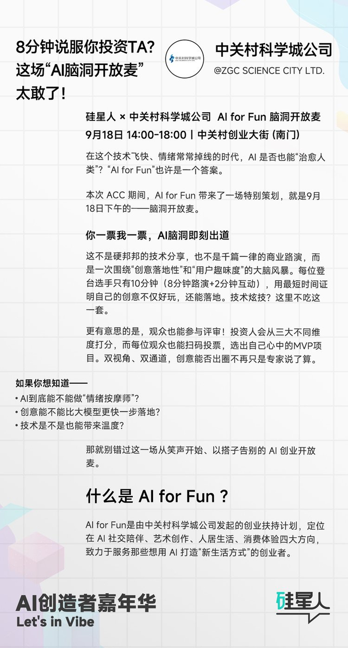 这一切,正是硅星人联合中关村创业大街共同发起的AI 创造者嘉年华(AI Creators Carnival)想做的事: