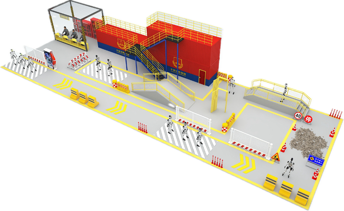 我们在张江科学会堂内搭建了一个全拟真的应急救援竞赛现场。参赛的具身智能机器人,必须在10m×30m的极限赛道中,按固定动线完成一系列对应现实应急救援关键步骤的高难度任务: