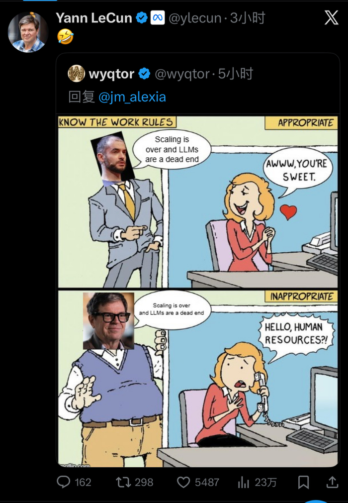 他们一个是LLM的异教徒,一个是LLM的改良者,但在2025年终于在同一个问题上走到了同一个立场。所以Yann Lecun后来在X上转发了一张漫画,也算是对类似论调的一种认同。