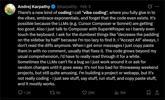 (一)“有一种新的编程方式,我叫它vibe coding。你把自己完全交给感觉,拥抱指数增长,忘记代码本身的存在。”