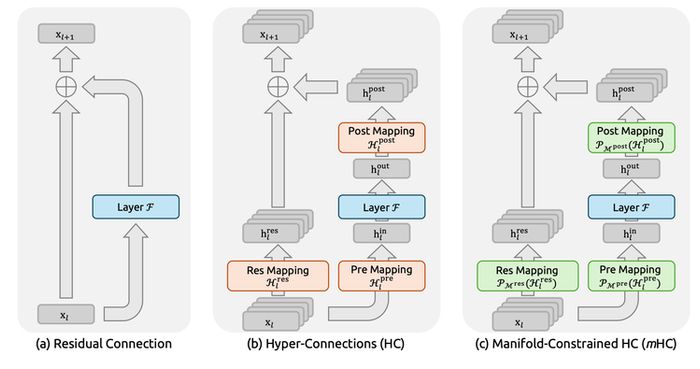翻译一下就是,ResNet是单股线(稳定但通道有限),Hyper-Connections是多股线(性能更强但容易“乱”),mHC就是那个智能理线器。