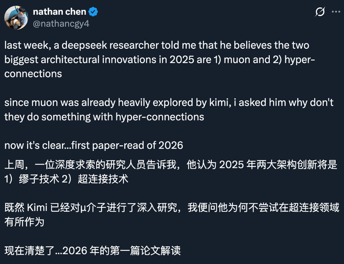 值得一提的是,Twitter用户@nathancgy4(Kimi研究员)表示,一位DeepSeek研究员在和他的交流中认为2025年最值得关注的两大架构创新是muon和hyper-connections。前者已被Kimi深度探索,而后者正是mHC的技术根基。这意味着mHC可能只是DeepSeek在这条路上的第一步。