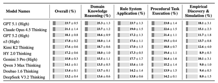 即便是表现最好的 GPT-5.1平均得分也仅为23.7分。