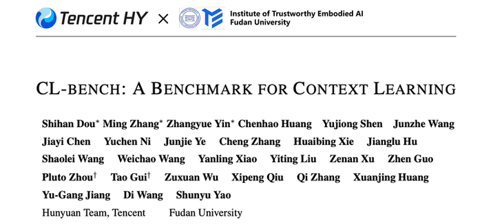 这篇论文叫CL-bench,全称Context Learning Benchmark,2026年2月3日由腾讯混元团队和复旦大学联合发布。作为项目负责人,姚顺雨排在作者列表的最后一位。