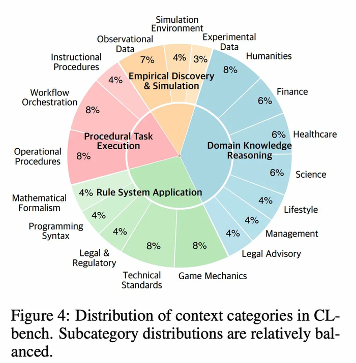 最终,CL-bench包含了500个复杂上下文、1899个任务、31607个验证标准。平均每个上下文的标注耗时约20小时,全部由资深领域专家制作。这个工作量本身就说明了研究团队的野心,他们想造的不是一个刷分榜单,而是一把真正能测出模型“学习能力”的尺子。