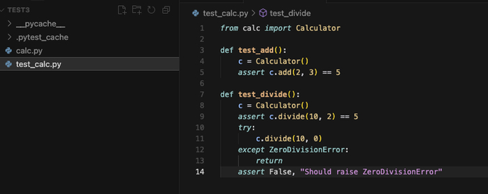 另外我们用最简单的方式看它能不能独立完成一次完整开发。只给它两个文件:一个空的 calc.py,一个测试文件 test_calc.py,要求实现加法和除法,还要能处理除以零的错误。