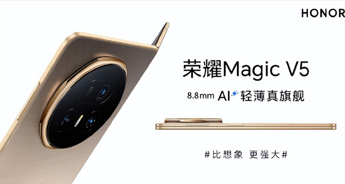 荣耀Magic V5正式官宣,新机定档7月2日发布,其在厚度方面取得全面突破。根据官方公布信息显示,其在折叠状态下机身最薄只有8.8毫米,这是有史以来折叠屏最薄纪录,相比还没有发布三星、vivo等竞品都要薄,技术方面了不起。