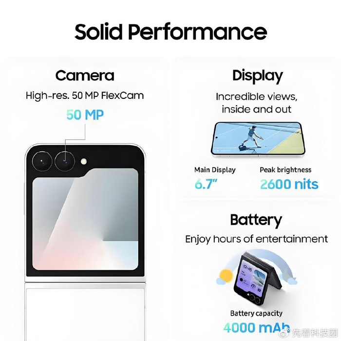 从外观和配置看,这款手机更像是三星Galaxy Z6 Flip“换名”版,或者说是上一代清库存版本。两款手机外观非常相似,副屏“斜刘海”都没有任何变化,甚至搭载上一代Exynos2400处理器,电池容量更是只有4000毫安,明显是廉价版手机。