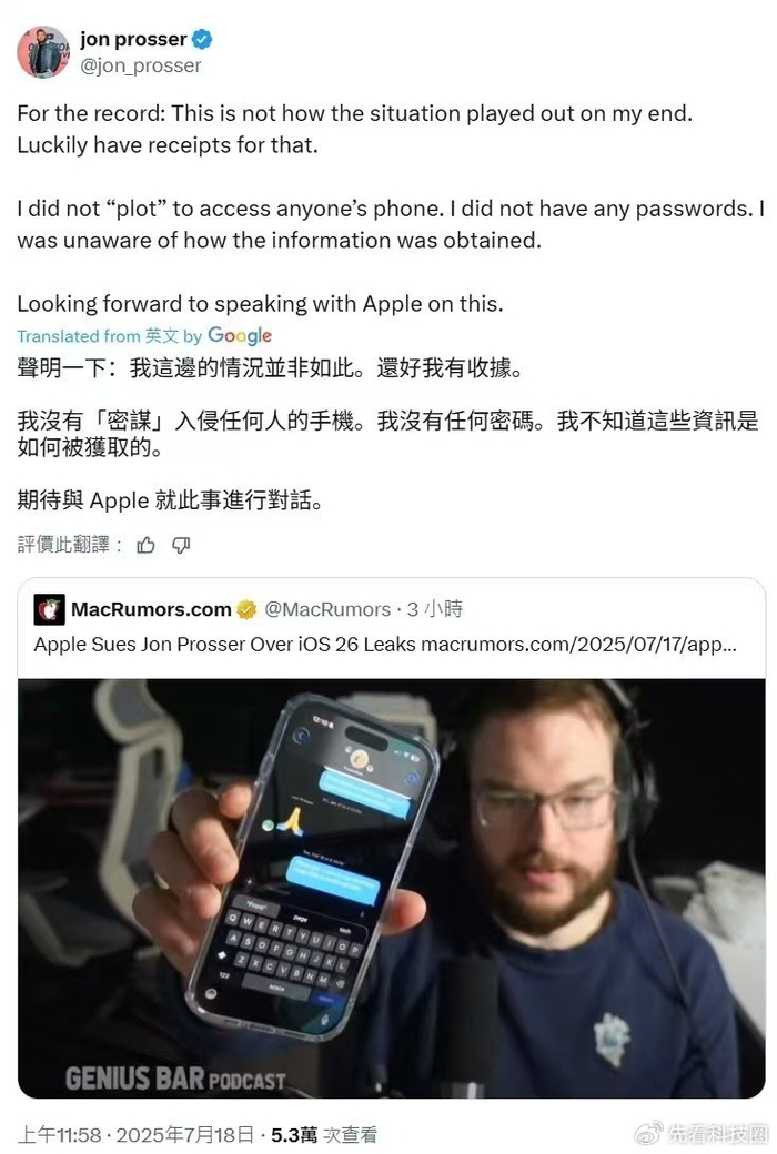 海外博主Jon Prosser可能是苹果唯一“认证”过的爆料者,原因是其泄密iOS 26新设计,苹果内部对此极为愤怒。iOS 26作为苹果重磅改名之作,今年6月才正式对外公布,Jon Prosser却在今年4月发布揭秘视频,提前公布液态玻璃设计元素。面对泄密,苹果公司于今年7月起诉该博主泄露商业机密,也从侧面验证了Jon Prosser消息的真实性,这一次公布iPhone折叠屏更可靠。