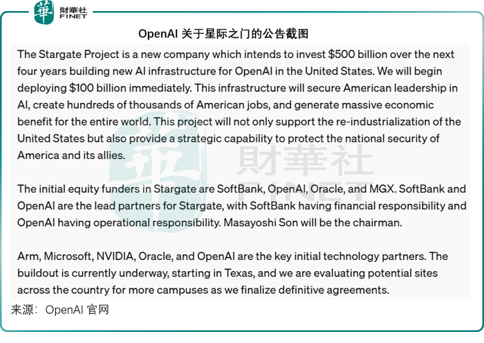 软银和OpenAI将为星际之门的主要合作伙伴,其中软银负责财务,OpenAI负责运营,孙正义将担任董事长。