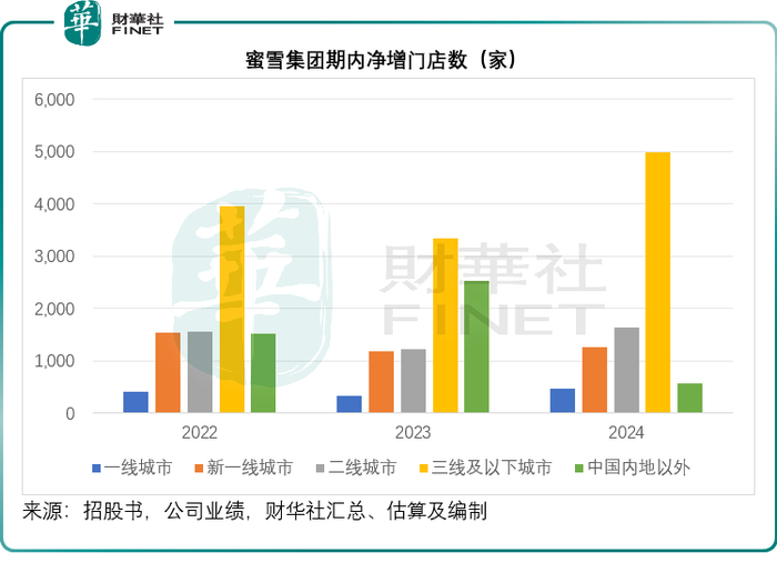 从门店扩张的侧重点来看,蜜雪于2023年一度加快了海外门店的扩张。不过,到2024年又重新聚焦于三线及以下城市的扩张,见下图。