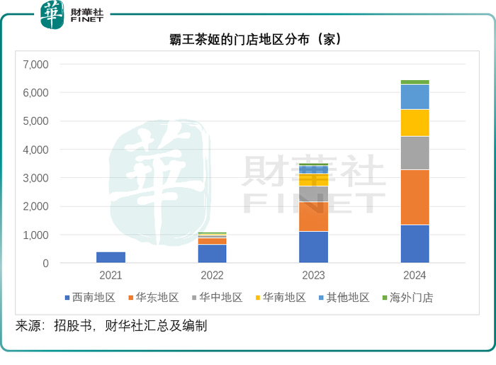 当前,华东地区已超越西南地区,成为霸王茶姬第一地区市场,拥有门店1,945家,高于西南地区的1,339家。