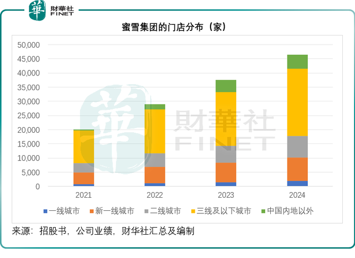 财华社留意到,就门店规模而言,三线及以下城市是蜜雪助力发功的地区市场。截至2024年末,其在中国三线及以下城市有2.39万家门店,占了总门店数的51.33%,见下图。