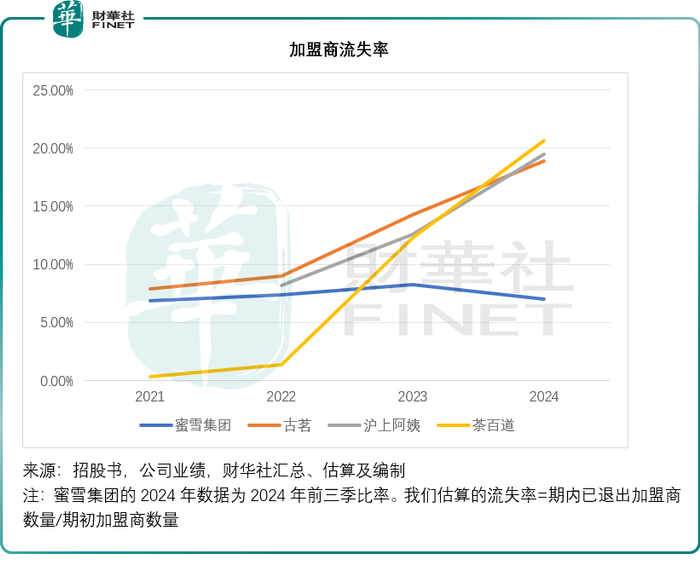 对此,财华社统一采用期内已退出加盟商数量与期初加盟商数量之比,计算四家上市茶饮品牌的加盟商流失率。