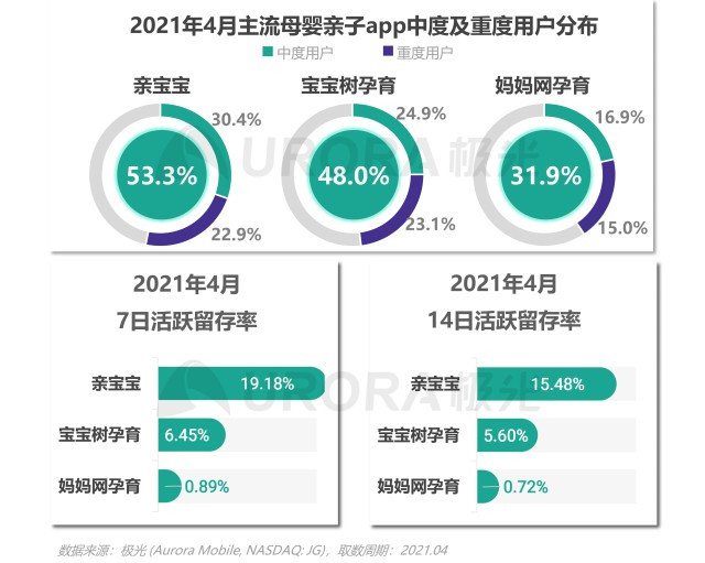 亲宝宝中度及重度用户占比和活跃留存更高