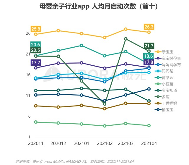 人均启动次数反映用户对app的使用粘性。对比人均月启动次数,截至2021年4月,亲宝宝用户平均每月启动app达26.3次,较半年前上升,使用频率最高