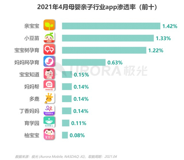 截至2021年4月,母婴亲子行业主流app中,亲宝宝凭借1.42%的渗透率排名行业第一,是覆盖人数最多的母婴亲子app
