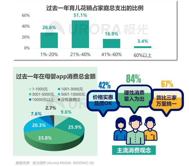 根据极光调研,超七成用户过去一年的育儿花销超过家庭总支出的20%,育儿成本较高