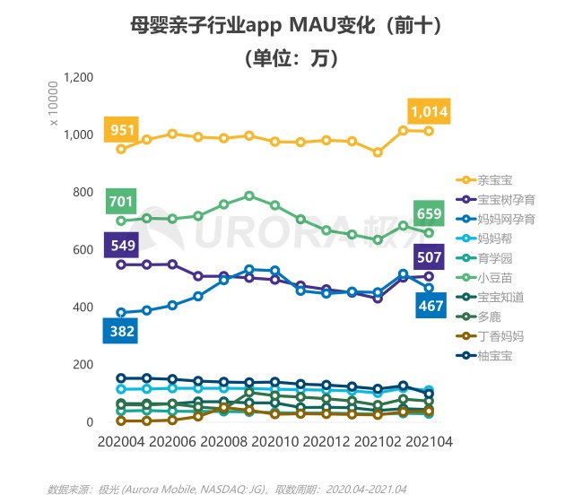 2021年4月亲宝宝的MAU达1014万,同比增长6.7%,是行业中唯一月活过千万的app,自2月份起活跃用户数增长明显;而小豆苗和宝宝树孕育则出现MAU同比下跌的情况,跌幅分别为6%和7.5%
