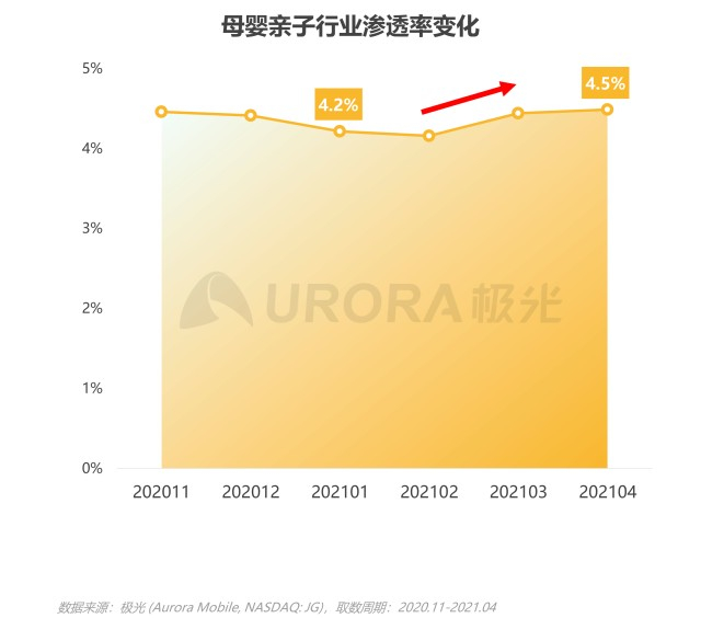 母婴亲子行业用户规模整体保持平稳向上趋势,2021年4月全网渗透率达4.5%,自春节以来持续上升,用户需求不断释放,随着90后、95后女性进入生育年龄,未来母婴亲子行业的发展前景明朗