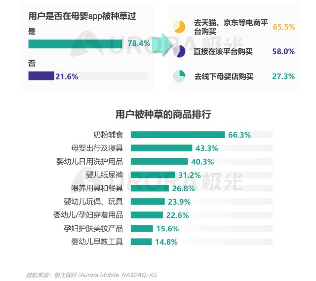 78.4%的用户在使用母婴app时曾被种草,种草后曾到天猫、京东等电商平台购买的用户有65.5%,曾直接在母婴app上购买的用户有58%