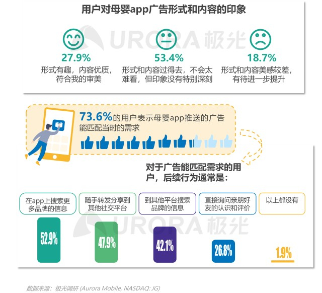 超过五成用户认为母婴app的广告形式和内容水平过得去,28%的用户欣赏看到的广告,19%的用户印象较差