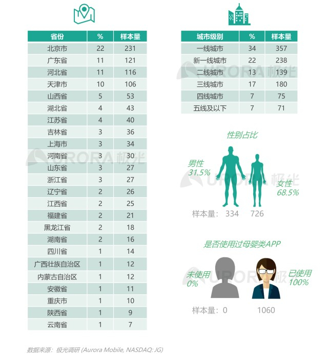 本次调研针对全国范围内母婴亲子类app的使用人群,该采样人群在近一年内均使用过母婴类app,样本量达1060,男性334,女性726