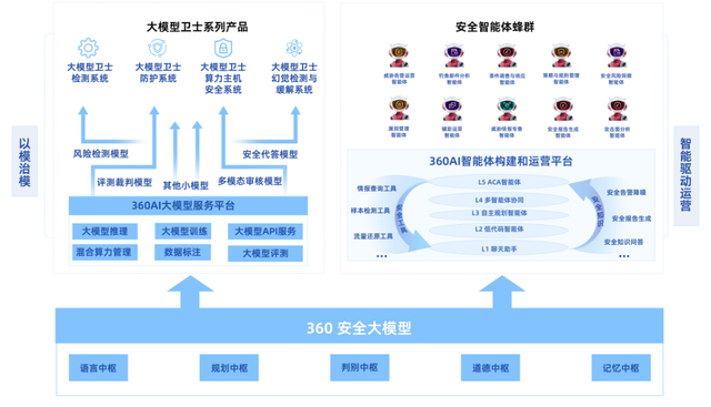 作为安全起家的公司,360深谙“发展必须与安全同步”的法则。在AI时代,其将安全能力进一步升维为治理智慧:一方面,通过以AI技术赋能安全场景,打造协同作战的安全智能体蜂群,实现威胁闭环处置;另一方面,坚持以“以模治模”思路对抗AI内生风险,推出大模型卫士系列产品,构建从安全检测到防护评测的系统性能力。