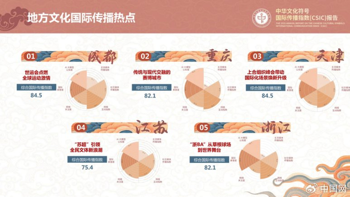 报告构建了2025年度中华文化国际传播符号矩阵,涵盖城市文旅、国潮非遗、音译中文、历史悬疑、东方奇境、春节全球化、中式食尚、烟火叙事、赛博民间交流、文博文创等十大维度。结合指数模型,报告形成了2025年度网络流行文化十大IP,依次是拉布布、南京照相馆、哪吒2、鸣潮、锦月如歌、捕风追影、浪浪山小妖怪、消失的厨神、燕云十六声和折腰,涵盖潮玩、电影、网络剧、微短剧、游戏、动漫等多种网络流行文化载体。同时,报告梳理出2025年具有国际影响力的五个地方文化国际传播热点,分别是世运会点燃全球运动激情(成都)、传统与现代交融的赛博城市(重庆)、上海合作组织峰会带动国际化场景焕新升级(天津)、“苏超”引领全民文体新浪潮(江苏)、“浙BA”从草根球场到世界舞台(浙江)。