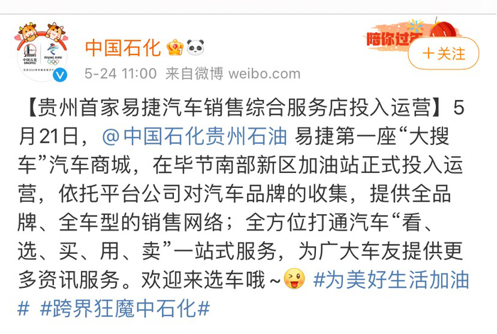 近日,据中国石油化工集团有限公司(以下简称“中石化”)官方平台发布消息,中石化与汽车产业互联网平台大搜车建立合作,联手打造易捷&大搜车汽车直购工厂店连锁服务品牌,目前首家线下商城已在贵州毕节南部新区加油站投入运营。此后,在中石化加油站不仅可以加油,逛便利店购买日用品,还可以选购新车,置换车辆,享受更多汽车相关服务体验。预计这一汽车销售服务综合店业态将在中石化全国2万多家加油站落地。
