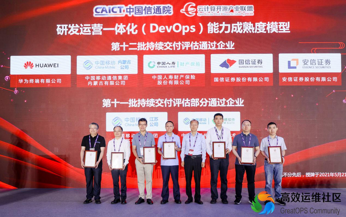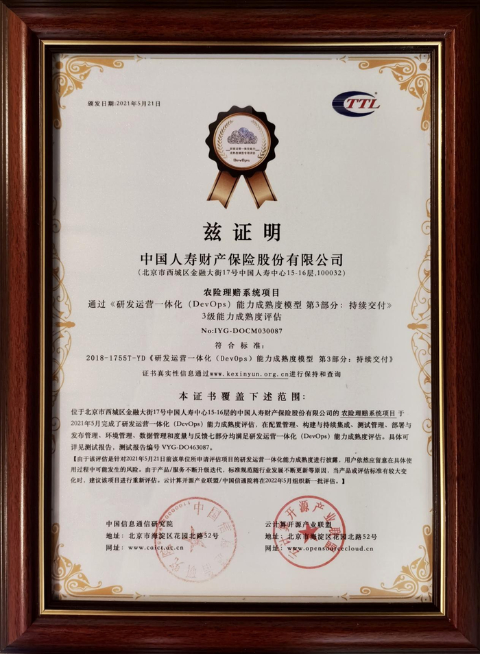 5月21日,在深圳召开的第十六届GOPS全球运维大会上,中国人寿财险农险理赔项目顺利通过DevOps持续交付标准3级评估,获得由中国信息通信研究院颁发的《研发运营一体化(DevOps)能力成熟度模型》持续交付评估证书,代表着中国人寿财险在持续交付能力上获得行业认可,也标志着农险理赔项目的持续交付能力达到国内领先水平。