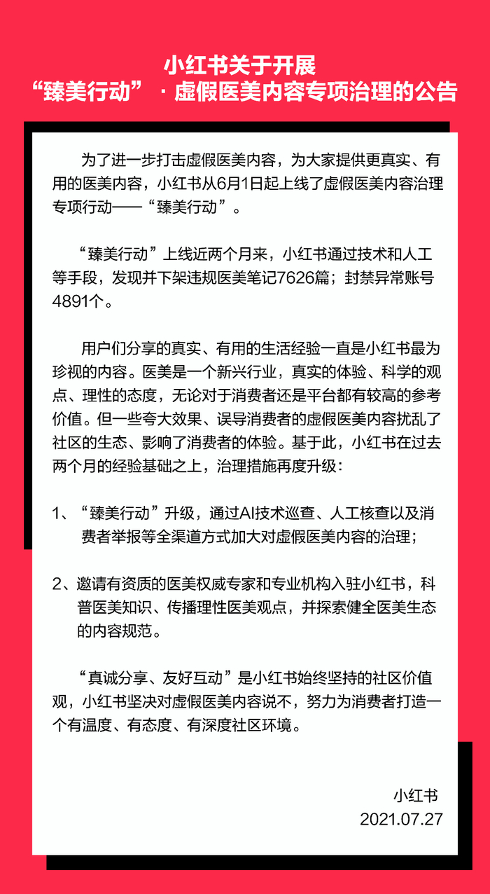 小红书公告还表示,将在未来一段时间内引入有资质的专业医美机构,探讨、健全医美审核标准;并引入权威医美专家,为消费者了解医美提供更多内容和视角。
