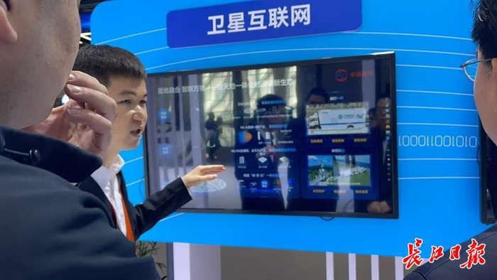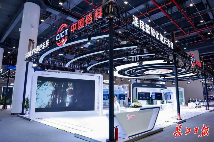 中国信科展台前,工作人员进行介绍。记者汪甦 摄