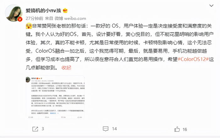 数码博主@爱搞机的小nv孩 也转发了Pete@刘作虎 的动态,并表示手机系统为用户服务,理应降低原有的学习成本,提供便利。在手机功能如此多元化的今天,是不是应当反过来思考一下如何为用户提供更多具有可行性的服务体验呢?