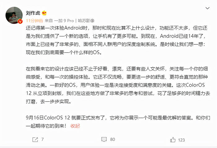 (刘作虎发博称ColorOS 12将为用户提供更多最优解方案)
