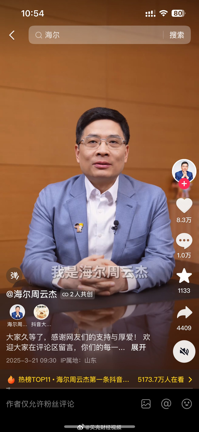 #海尔CEO抖音号不到一小时涨粉20万#【海尔周云杰入驻抖音,不到一个小时粉丝冲破20万】3月21日,海尔董事局主席、CEO周云杰发布首条抖音,宣布正式入驻平台。周云杰在视频中表示,开通账号的目的是想建立与网友零距离交互的平台,未来会分享海尔故事、倾听网友需求并征集用户建议。目前,周云杰首条抖音发布45分钟获赞1.9万,评论数超过3000,抖音账号粉丝快速升至20.8万。#Leader懒人洗衣机能洗鞋了#(时代财经)