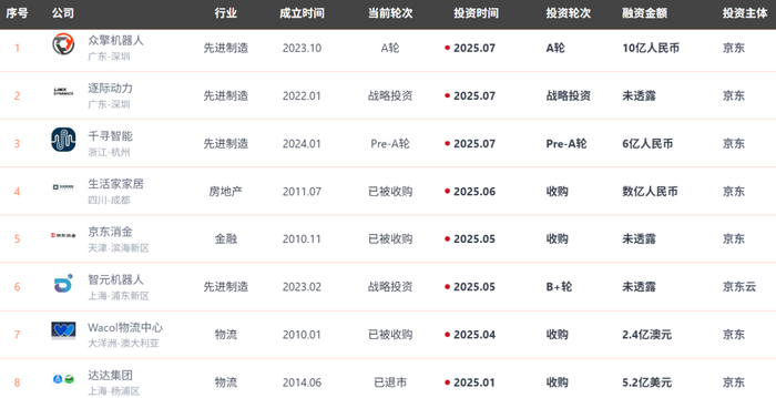 据IT 桔子数据,截至目前,京东系在2025年进行了 8笔投资并购,涉及多个行业,被投公司分布在机器人、房地产、金融、物流这四大领域。