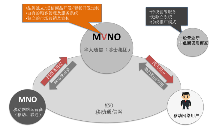 MVNO的英文全称为“Mobil Virtual Network Operator”译为“虚拟运营商”。是指与电信运营商建立合作伙伴关系,可直接向KT,SKT,LG U+这三大韩国传统运营商购买底层基础设施服务,并且依照客户群体的通信需求与可接受价格来制定该公司的“专属”通信服务,除此之外,还拥有客服体系,运行体系等多项自主权。虚拟运营商的出现可以减少及消化过盛的通信供给,缓解“供过于求”的市场现状。同时也可以避免传统运营商的市场垄断,促进行业良性竞争。基于此类众多好处,中国也于近几年正式开放虚拟运营商拍照,更有阿里巴巴、京东等知名企业争相获得虚拟运营商正式牌照。