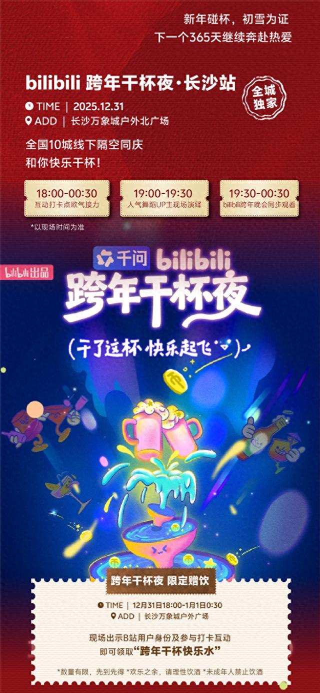 本次跨年的亮点是全城独家呈现的“bilibili跨年干杯夜·长沙站”。活动将于12月31日18:00至次日00:30在商场户外北广场举行。现场不仅有人气UP主带来精彩演出,还将同步直播B站跨年晚会,与全国十城线下联动。参与者可体验互动打卡集章、许愿池投递心愿、参与十城干杯接力等环节,并可领取“跨年干杯快乐水”赠饮。