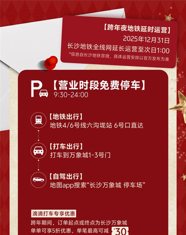 为便利市民跨年出行,2025年12月31日,长沙地铁全线网将延长运营至次日1:00。商场在营业时段(9:30-24:00)提供免费停车服务,会员还可享相应时长免费停车权益。使用滴滴打车,起点或终点为万象城的订单可享5折优惠,单笔最高减30元。
