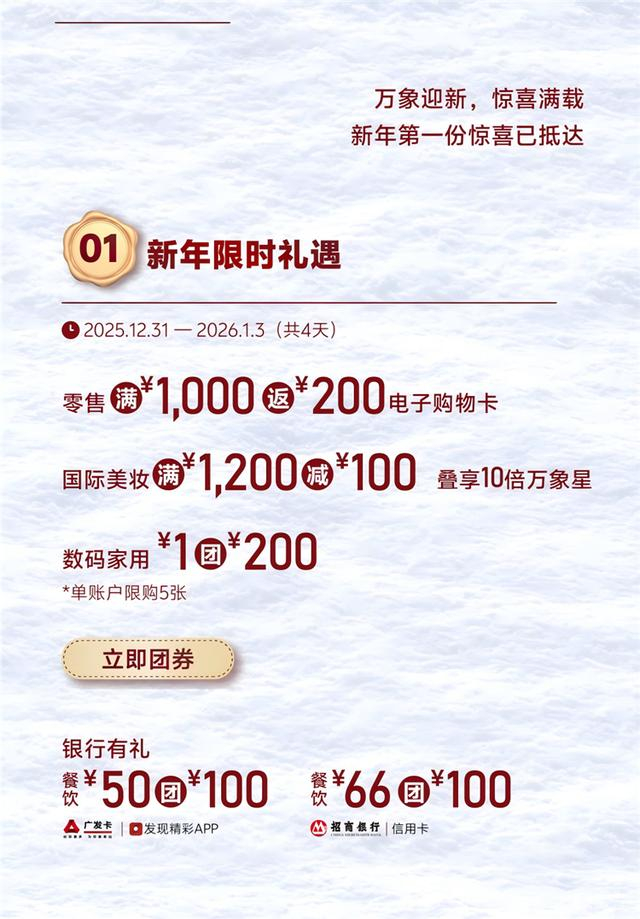 跨年期间,长沙万象城联合众多品牌推出系列促销活动。即日起至2026年1月3日,零售品类满1000元返200元电子购物卡,国际美妆满1200元减100元,数码家电推出团购优惠。黄金珠宝品类还可在美团/大众点评专享960元团1000元优惠券。广发卡、招商银行持卡用户可在指定餐饮品牌享受专属优惠。