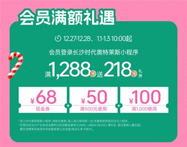 2026年1月1日至3日期间,每日10:00起,会员登录商场小程序,单日累计消费满500元即可获得68元礼券,满1288元可获赠价值218元礼券包(内含50元及100元现金券等多重礼券)。该活动每日限量领取,部分非中央收银商户暂不参与。