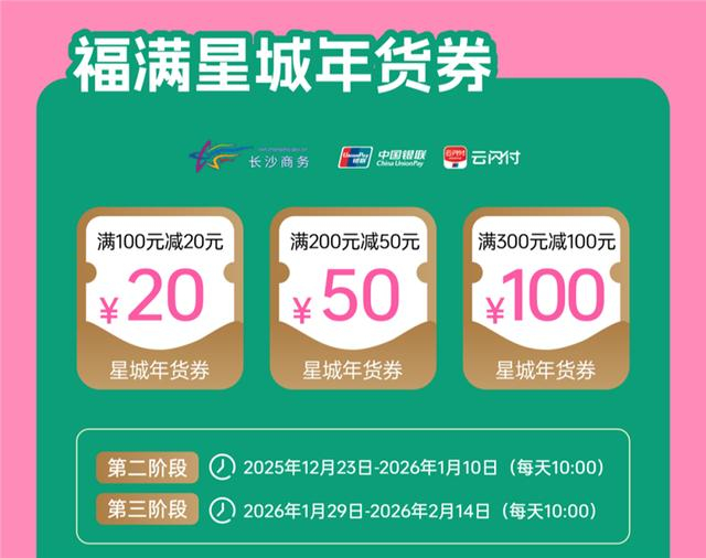 “福满星城”政府消费券同步助力岁末消费。活动第二阶段已于2025年12月23日启动,持续至2026年1月10日;第三阶段将于2026年1月29日至2月14日开展。每日上午10:00,消费者可登录云闪付APP,进入“U惠湖南-政府消费券”页面领取券包,享受满100元减20元、满200元减50元、满300元减100元等多档优惠。该消费券适用于商场内指定中央收银商户,为市民购置年货、新年装备提供实惠补贴。