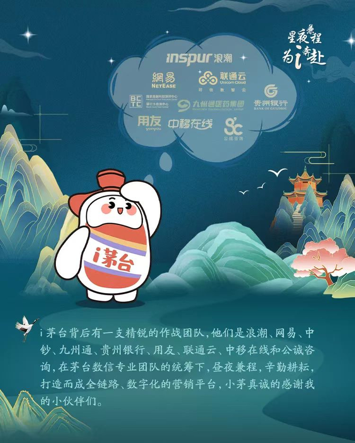 4月6日,贵州茅台官微发布的长图揭秘了i茅台背后的生力军,其中提到来自浪潮、网易、中钞、九州通、贵州银行、用友、联通云、中移在线和公诚咨询的精英人员,在茅台数信专业团队的统筹下,才打造出了i茅台这一全链路、数字化营销平台。
