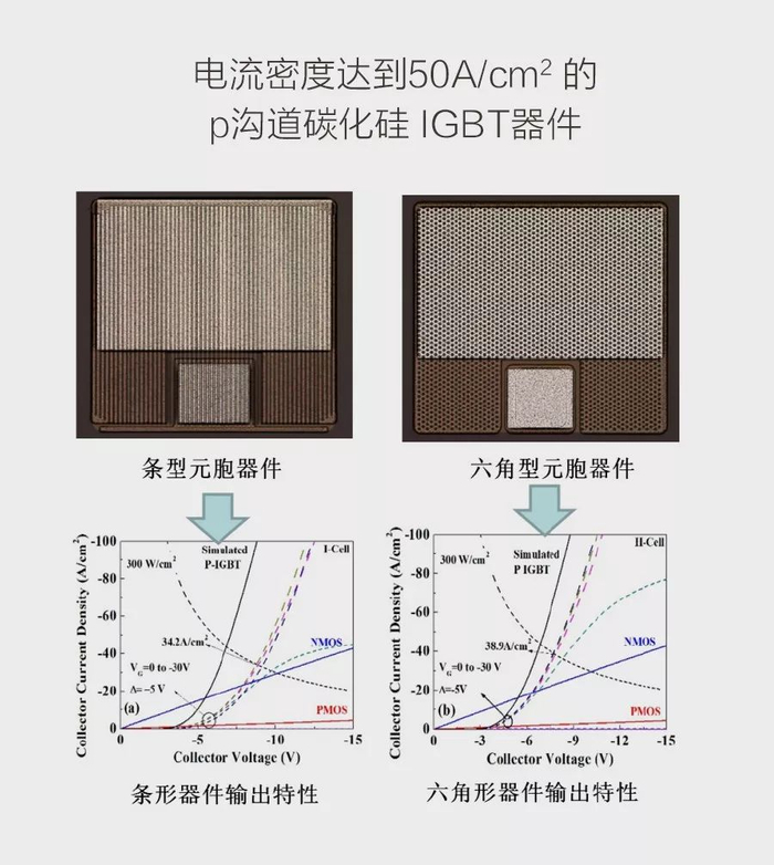 在此基础上,研究团队调整元胞布局结构,成功实现导通电流密度突破50A/cm2 ,这在国内尚属首次。在功率密度为300W/cm2的封装极限下,研究团队采用六角形元胞将碳化硅 IGBT的导通电流密度提升至接近40A/cm2,微分比导通电阻提升至56.92 mΩ•cm2,相比于同等阻断电压的碳化硅 MOSFET器件,碳化硅 IGBT漂移层具有载流子注入增强效应,因而导通性能大大提升,这极大地降低了高压电力电子功率变换器的导通损耗。研究团队所研制的条形元胞和六角形元胞IGBT器件均超过碳化硅材料单极型极限,性能达到国内领先水平,这再一次表明:通过减少碳化硅厚膜外延层中的缺陷密度,尤其是深能级缺陷密度,减少MOS结构界面态和表面态,提高碳化硅快速外延生长技术,可以大幅提高碳化硅 IGBT器件的导通能力。