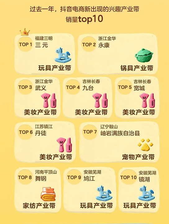 但或许很多人不知道,这些一二线城市年轻人钟爱的情感、兴趣消费,原产地正来自中国兴趣产业带的腹地——广袤的县域工厂,也是实体经济真正的毛细血管。过去一年,抖音电商兴趣产业带中有6000多个来自县域,它们贡献了近四分之一的兴趣产业带成交额。