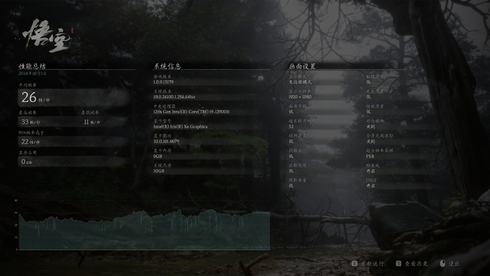 我用零刻GTi12 Ultrra跑了一遍《黑神话:悟空》测试工具,1080P分辨率+全低画质+DLSS极致性能+开启帧生成+关闭光追,平均帧数只有26,进游戏后画面卡顿就像播放PPT,谈何游戏体验?!